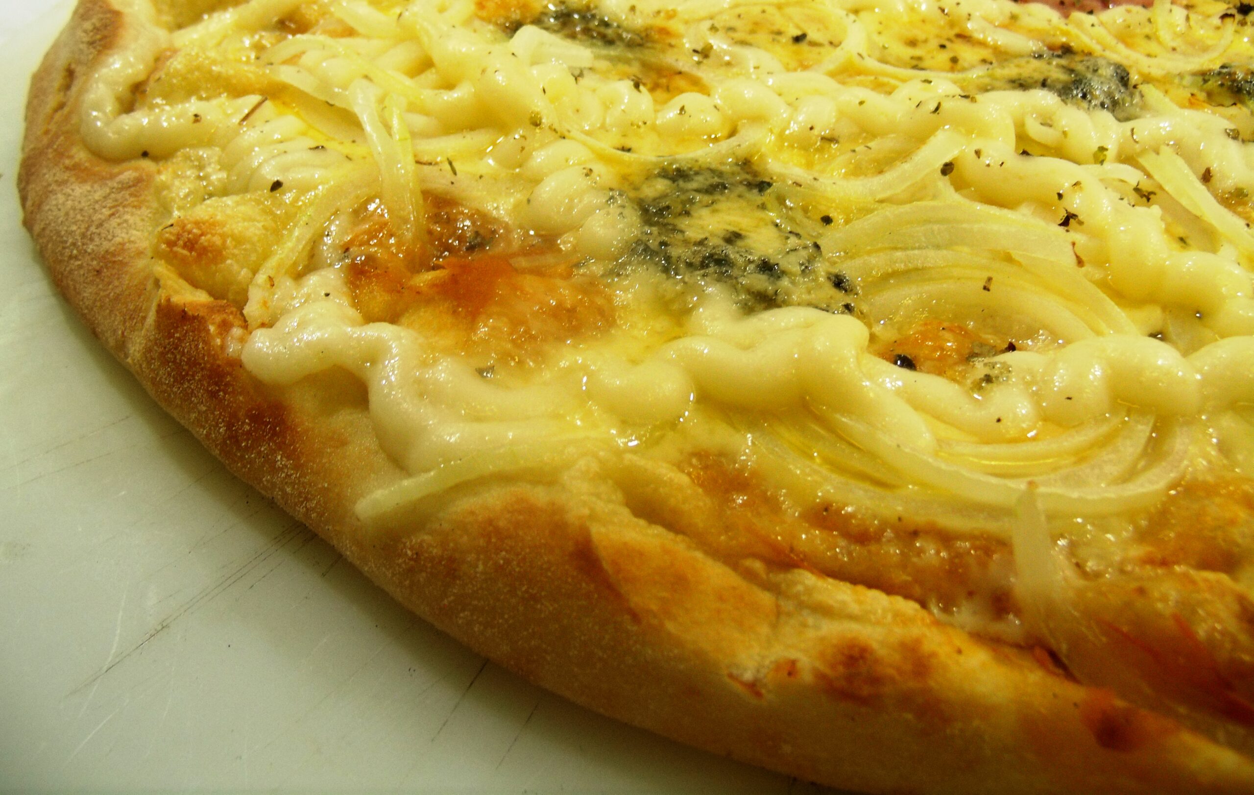 Ingredientes: molho, mussarela, cebola, gorgonzola, catupiry e orégano.