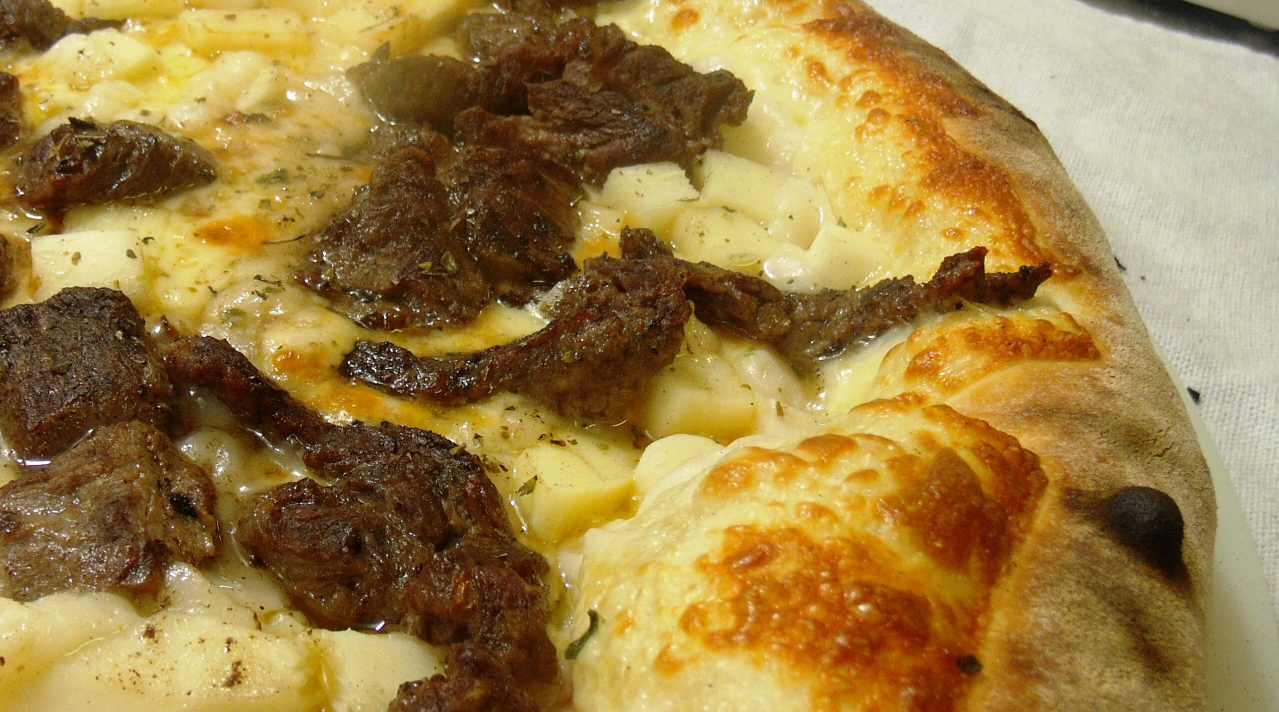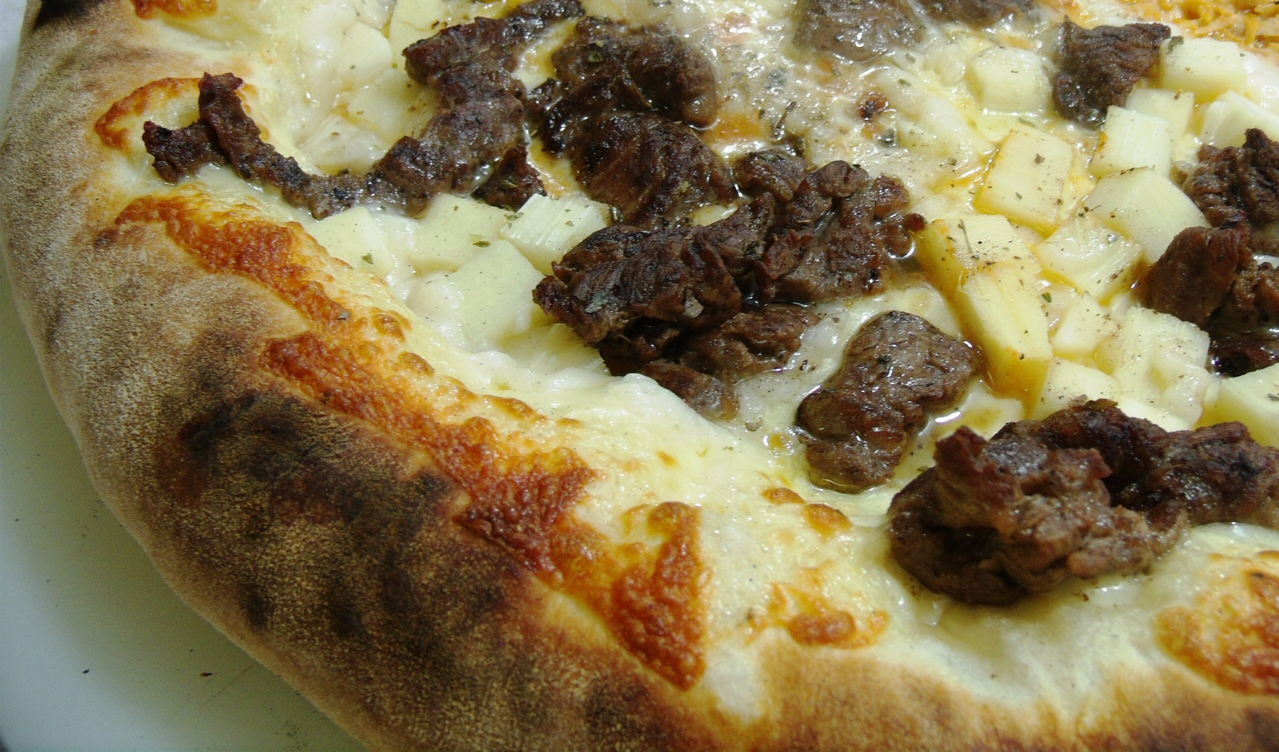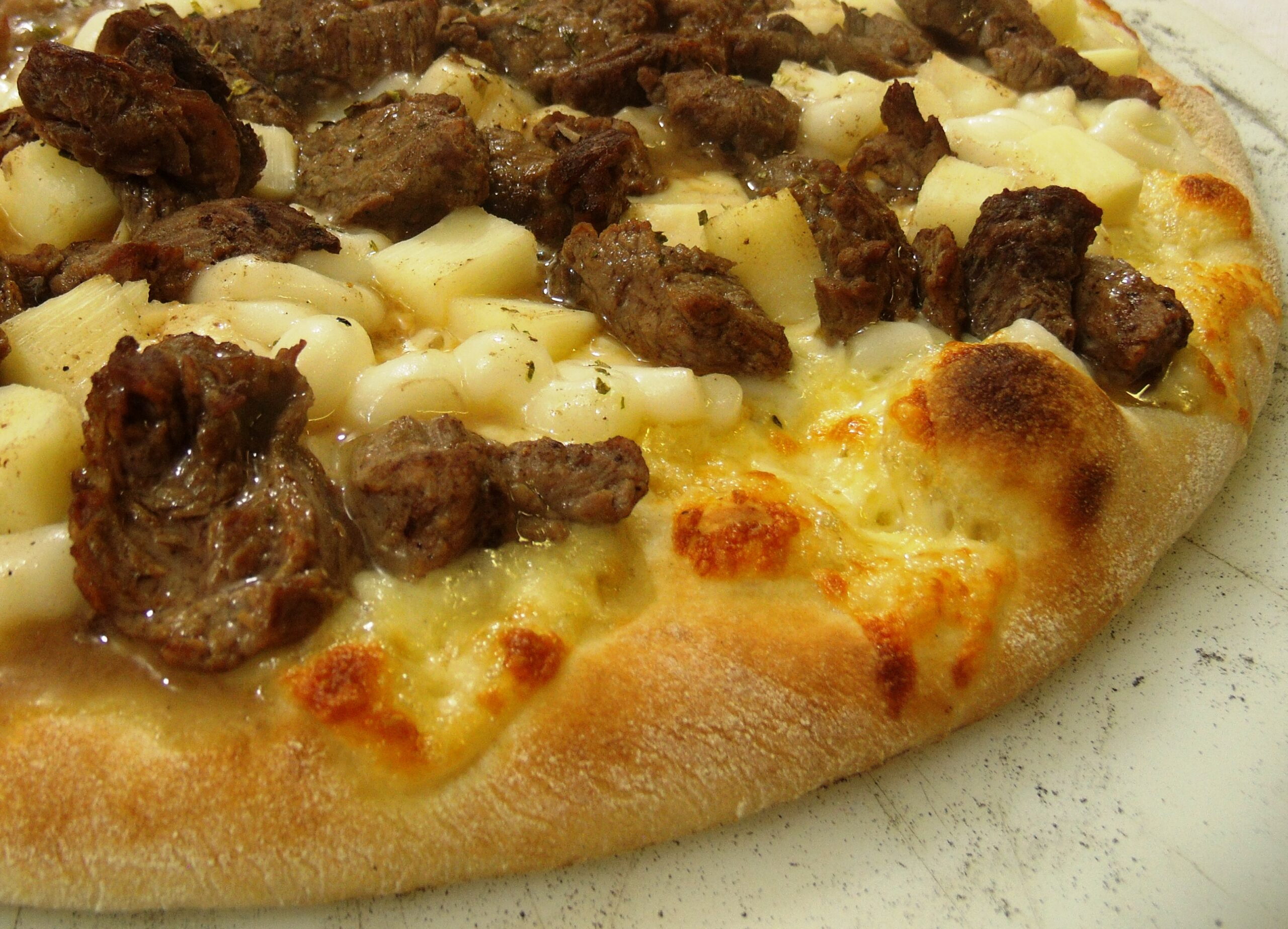Ingredientes: molho, mussarela, catupiry, palmito, filé-mignon em cubos e orégano.